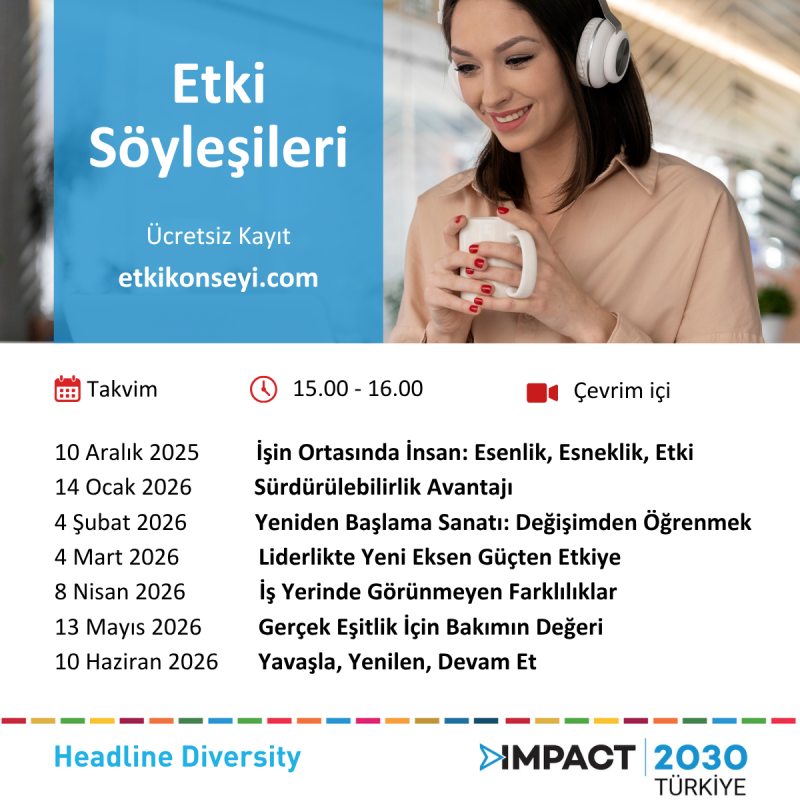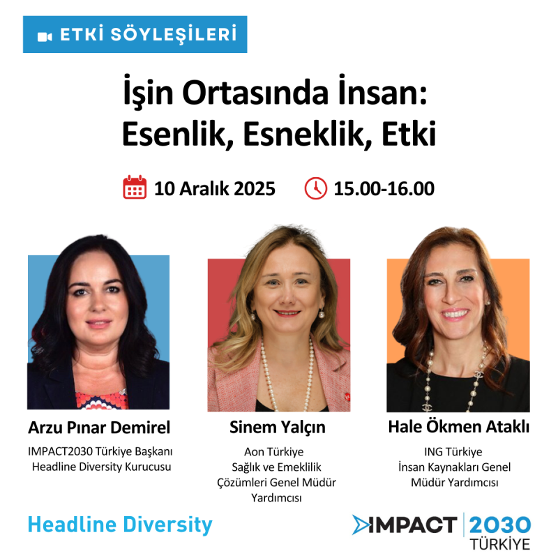 Her ay, Headline Diversity iş birliğiyle düzenlediğimiz Etki Söyleşileri’nde çevrim içi olarak bir araya geliyoruz.IMPACT2030 Türkiye Başkanı Arzu Pınar Demirel’in moderasyonunda gerçekleşen bu dönemki söyleşilerin teması ”İşin Ortasında İnsan.” İlham veren konuşmacılarla, iş dünyasında insan odaklı dönüşümün, farklı boyutlarını keşfetmek için yerinizi hemen ayırın.